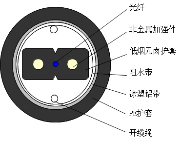 接入網(wǎng)用蝶形引入室內(nèi)光纜是將光通信單元處于中心,兩側(cè)放置兩根平行非金屬加強元件(FRP),擠制黑色低煙無鹵護套。外包鋁帶防潮層,最后擠制PE護套成纜。