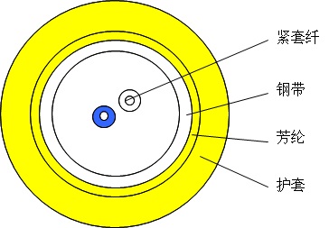 煤礦用室內光纜使用Φ600µm阻燃緊套光纖作為光傳輸介質,采用不銹鋼軟管來增強光纜的抗扭轉性能,外覆一層芳綸作為受力加強單元,最外擠制一層低煙無鹵材料(LSZH,低煙、無鹵、阻燃)護套而成。