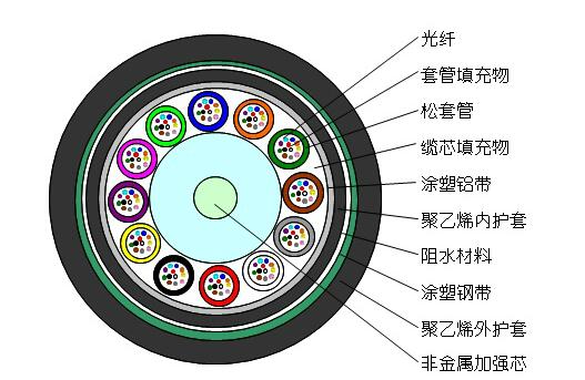 GYFTA53光纜的結(jié)構(gòu)是將250µm光纖套入高模量材料制成的松套管中,松套管內(nèi)填充防水化合物。纜芯的中心是一根非金屬加強(qiáng)芯(FRP),對(duì)于某些芯數(shù)的光纜來(lái)說(shuō),非金屬加強(qiáng)芯外還需擠上一層聚乙烯(PE)。松套管(和填充繩)圍繞中心加強(qiáng)芯絞合成緊湊和圓形的纜芯,纜芯內(nèi)的縫隙充以阻水填充物。涂塑鋁帶(APL)縱包后擠上一層聚乙烯內(nèi)護(hù)套,雙面涂塑鋼帶(PSP)縱包后擠制聚乙烯外護(hù)套成纜。